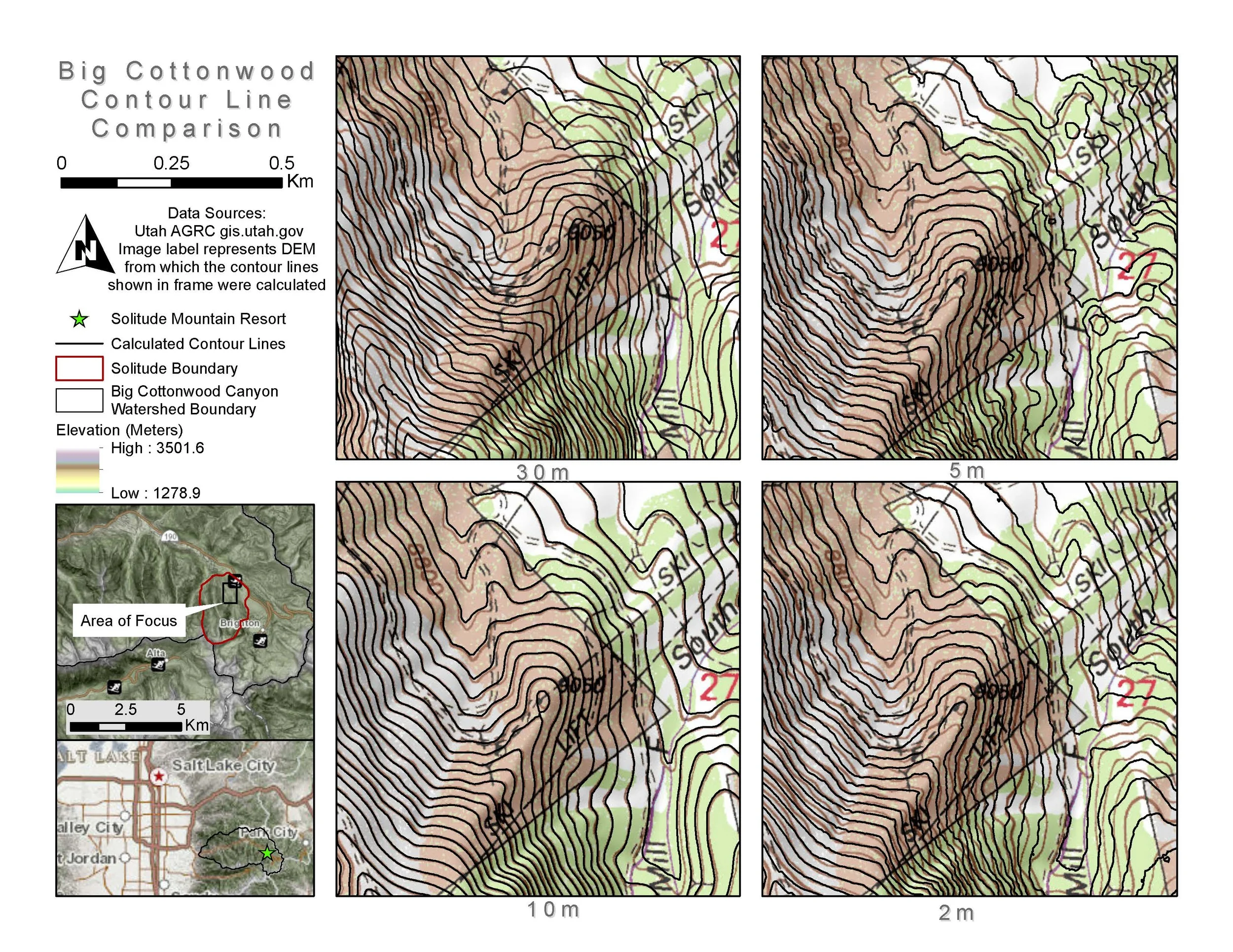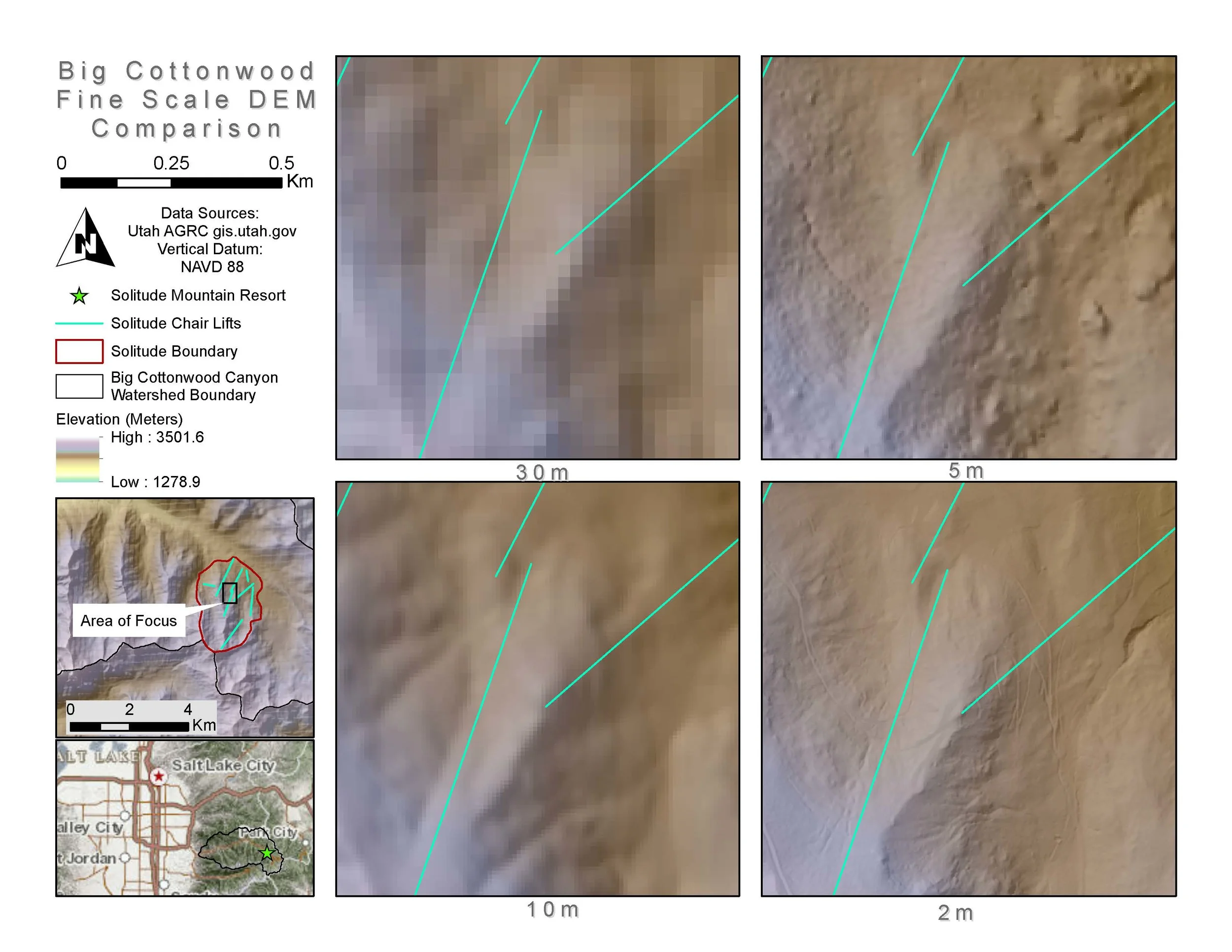 Though I preferred the 10 meter DEM at the watershed scale, it may not be the same preference at a finer scale. For assess each DEM set at a closer in resolution, I looked at each DEM in the area of Solitude Mountain Resort.